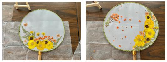 活动伊始,工作人员向大家介绍了传统团扇的文化背景和干花团扇的制作步骤及要领。大家根据材料包配的干花,用自己灵巧的双手,在素白的扇面上,认真选材,细细构图、大胆设计、精心粘制,一边摆弄一边交流,忙得不亦乐乎,同时发挥自己的想象力,没多久,一把把造型优美的团扇相继出炉,不仅能够纳凉消暑,还很与众不同。